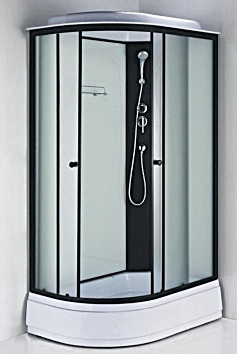 Душевая кабина, средний закругленный поддон 26 см, черный алюминиевый профиль, черная центральная панель, передние стекла матовые, задние стекла белые, черные ручки и ролики с кнопкой, верхний и ручной душ, полочка, черные магниты, две двери, раздвижной механизм.