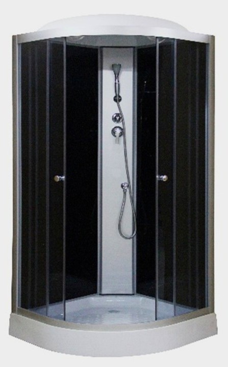 Душевая кабина, низкий полукруглый поддон 12 см с бортиком, серебристый алюминиевый профиль, серебристая центральная панель, 4 мм передние тонированные стекла, 4 мм задние стекла черные в алюминиевом профиле, верхний и ручной душ, полочка, две двери, раздвижной механизм.