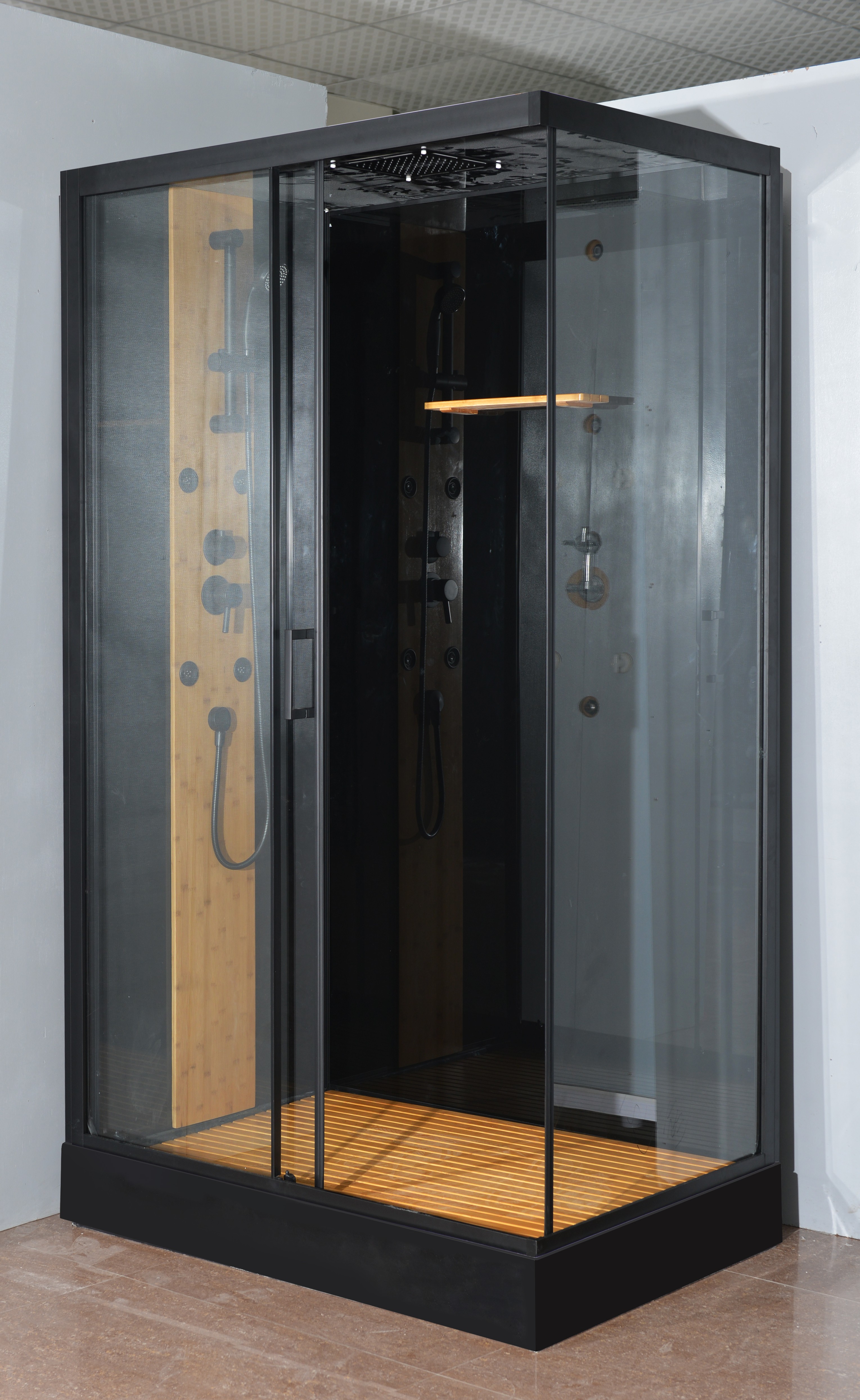 Душевая кабина, низкий черный прямоугольный поддон 15 см, передние стекла прозрачные толщиной 5 мм, задние стекла черные толщиной 5 мм, черный алюминиевый профиль, черная стеклянная крыша, черный верхний и нижний душ, 4 черные массажные форсунки, одна дверь, раздвижной механизм, настил в поддон, центральная панель и полка из бамбука.