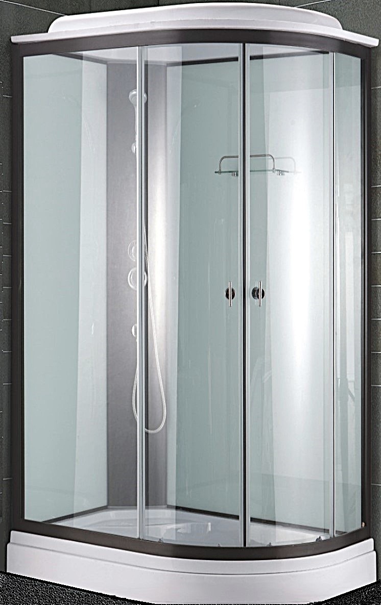 Душевая кабина, низкий закругленный поддон 12 см с бортиком, черный алюминиевый профиль, черная центральная панель, передние стекла матовые 4 мм, задние стекла белые 4 мм в черном алюминиевом профиле, черные ручки и ролики с кнопкой, верхний и ручной душ, полочка, черные магниты, две двери, раздвижной механизм.