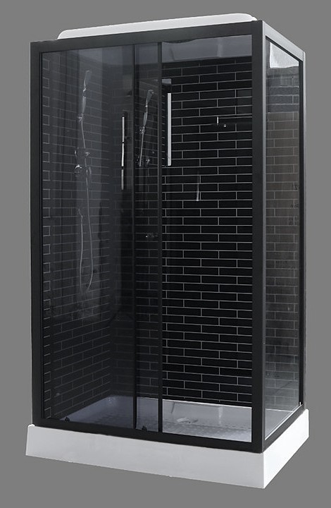Душевая кабина с низким прямоугольным поддоном 15 см, черный алюминиевый профиль, 5 мм передние серые тонированные стекла, 4 мм задние стекла с рисунком черной кирпичной кладки, верхний и ручной душ, зеркало, полочка, черные ролики с кнопкой. Одна раздвижная дверь.