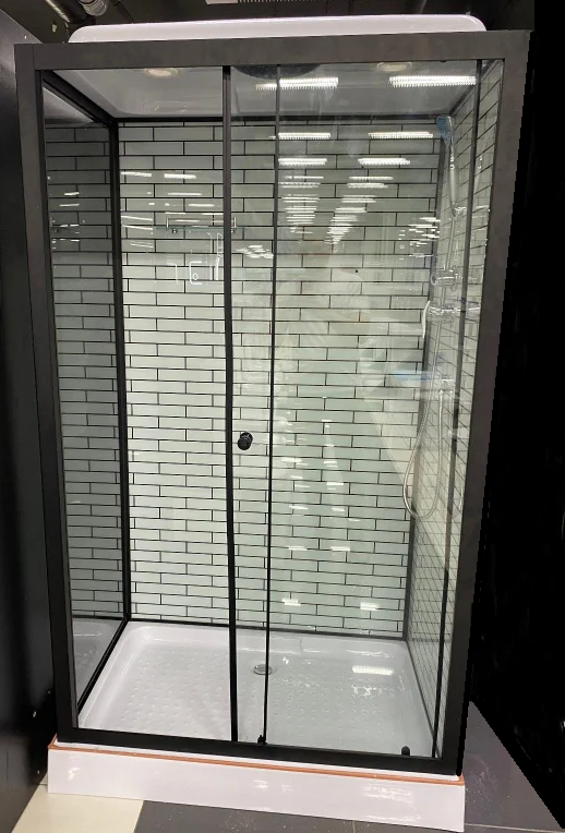 Душевая кабина низкий прямоугольный поддон 15 см, черный алюминиевый профиль, 5 мм передние прозрачные стекла, 4 мм задние стекла с рисунком белой кирпичной кладки, верхний и ручной душ, зеркало, полочка, черные ролики с кнопкой. Одна дверь, раздвижной механизм.