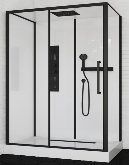 Душевой бокс БЕЗ ЭЛЕКТРИКИ низкий поддон 12 см с бортиком, алюминиевый черный профиль, черная панель из нержавеющей стали с форсунками, белая стеклянная крыша,передние стекла прозрачные, задние стекла белые, боковые стекла и передние стекла толщиной 6мм, черный верхний душ из нержавеющей стали, черный ручной душ, черный трап в поддоне, отбойный ролик, черная полочка, одна дверь с универсальной установкой (левая/правая), раздвижной механизм.