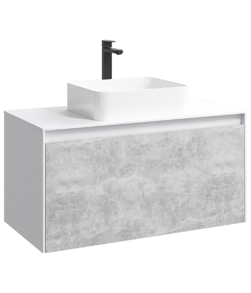 Подвесная тумба 100 см с двумя ящиками: основной и внутренний, скрытый за фасадом. Цвет белый/бетон светлый; с умывальником