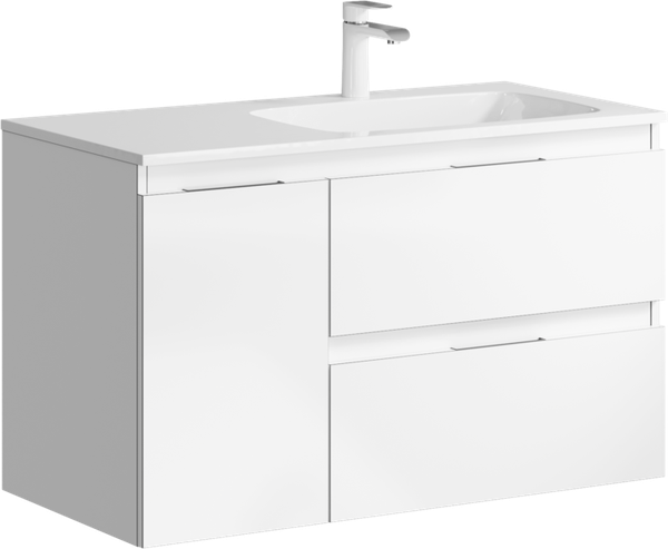 Подвесная тумба с двумя ящиками и одной дверью в белом цвете с умывальником из литьевого мрамора (чаша справа) ACC0109RW Нажмите для увеличения
